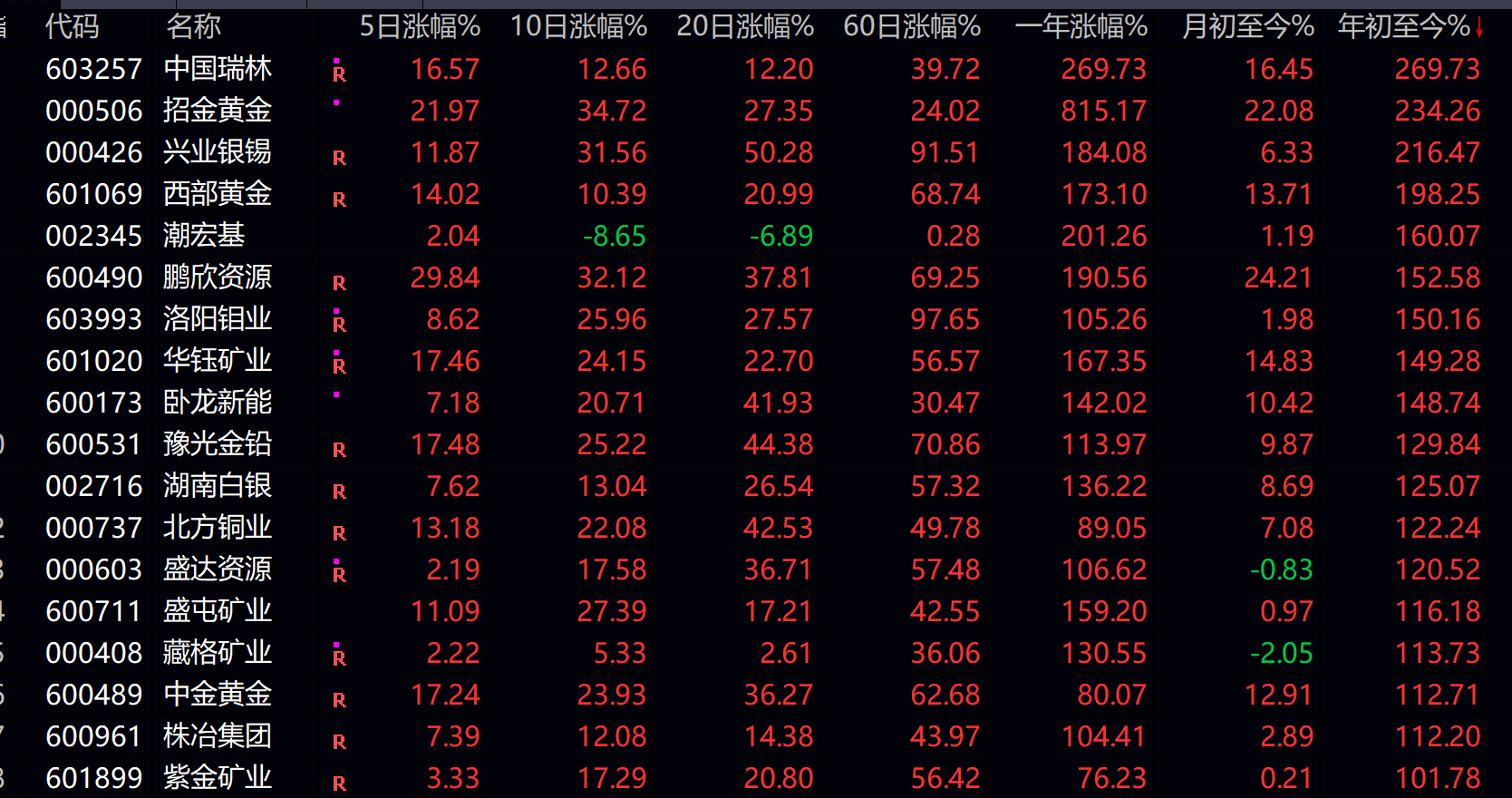 截至10月14日收盘,贵金属板块有14只个股股价年内实现翻倍,中国瑞林、招金黄金和兴业银锡的涨幅位居前三,均超过200%,分别为269.7%、234.3%和216.5%。